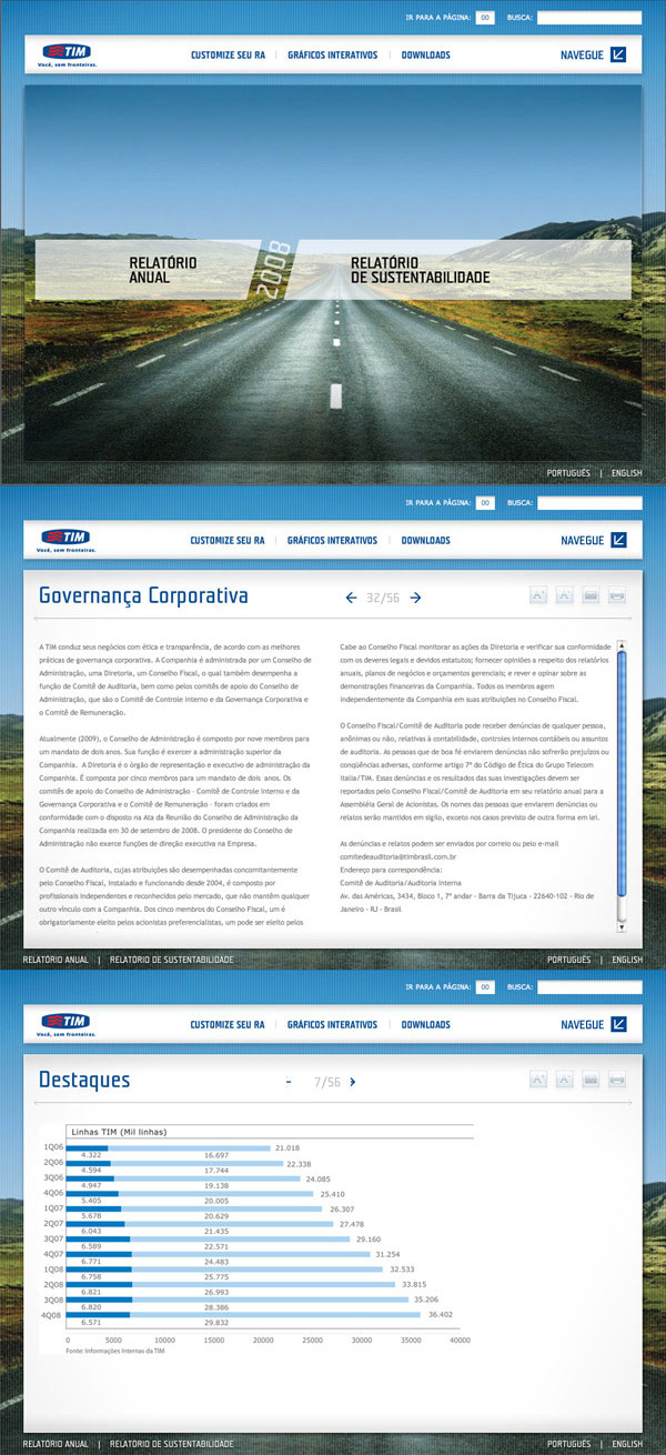 Annual report for TIM Annual Report, TIM, Web, Graphic design for TIM’s online annual report (telecom) (2008). Projeto gráfico para relatório anual online da TIM (telecomunicações) (2008).
